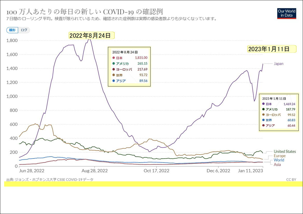 世界でみても、日本は 100万人当たりに換算した数字 ( 7日間移動平均 ) は 3.03人(1月11日)とダントツに高い。以下、「Our World in Data」を見てほしい。