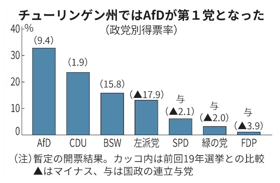 東部テューリンゲン州で1日に行われた州議会選挙では、AfDが第1党となった。州議会で極右政党が勝利したのは、第2次世界大戦後で初めて。